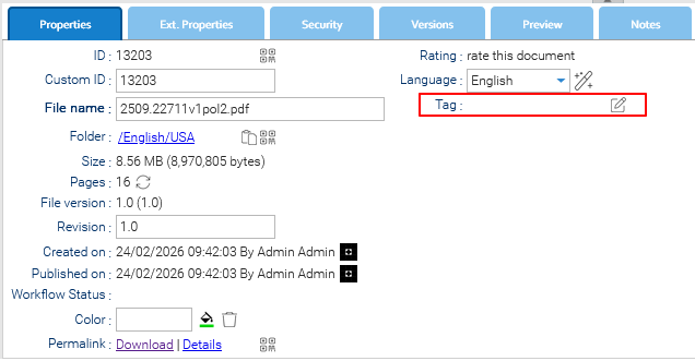 With the document selected, open the Properties tab and click on the Edit tags icon next to the Tags label.