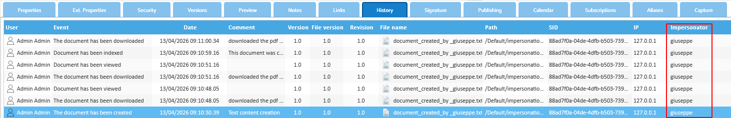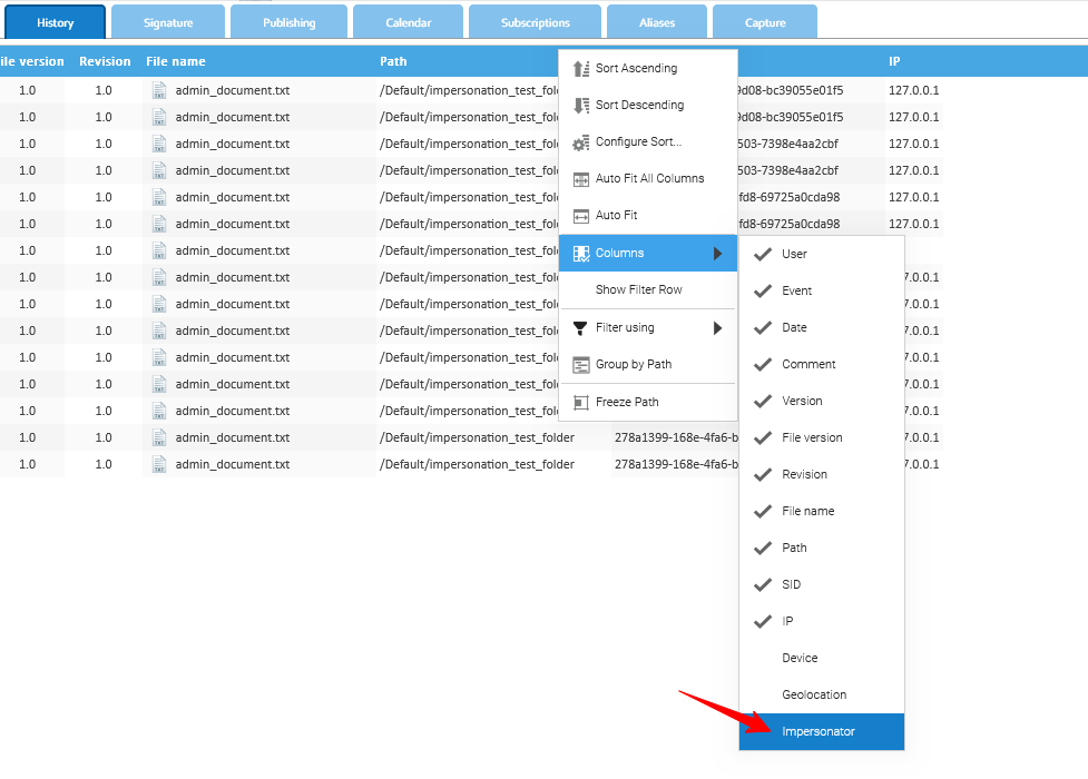 To verify actions taken by impersonators, select the document and open the History tab. Add the Impersonator column by right-clicking the table header and selecting Columns > Impersonator.