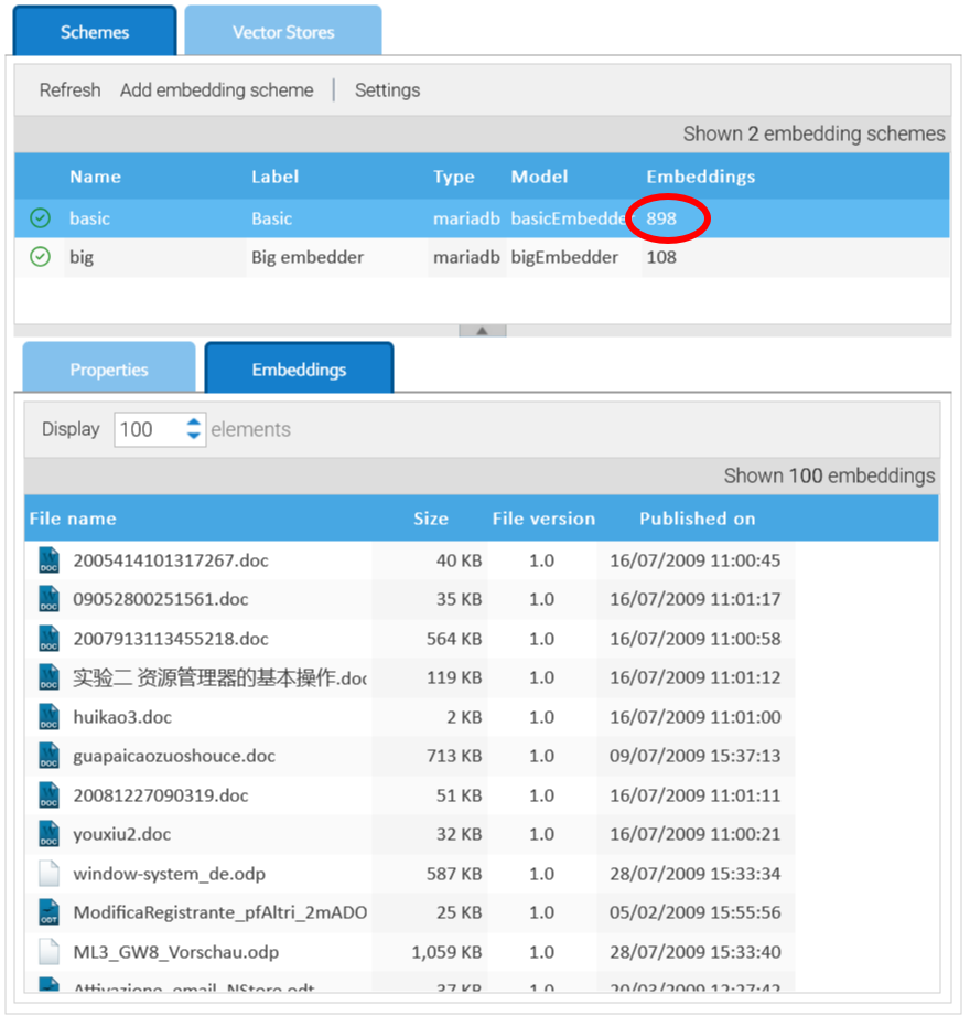 En Administración > Inteligencia Artificial > Embeddings, puede gestionar diferentes esquemas de incrustación, cada uno de los cuales indica a LogicalDOC cómo procesar los documentos con un modelo de incrustación específico.