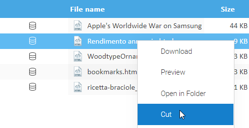 En la lista de documentos, seleccione los elementos que desea mover y luego haga clic derecho sobre ellos y elegia la opción Cortar del menú contextual. Esto pondrá la selección actual en el clipboard.