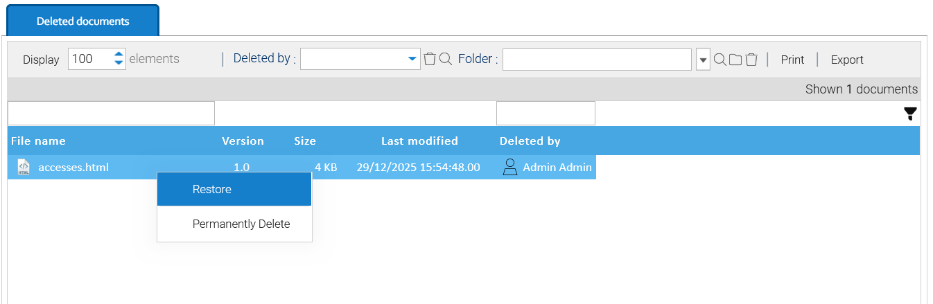 Este informe le muestra todos los documentos que fueron eliminados lógicamente, también puede filtrar por usuario y carpeta.