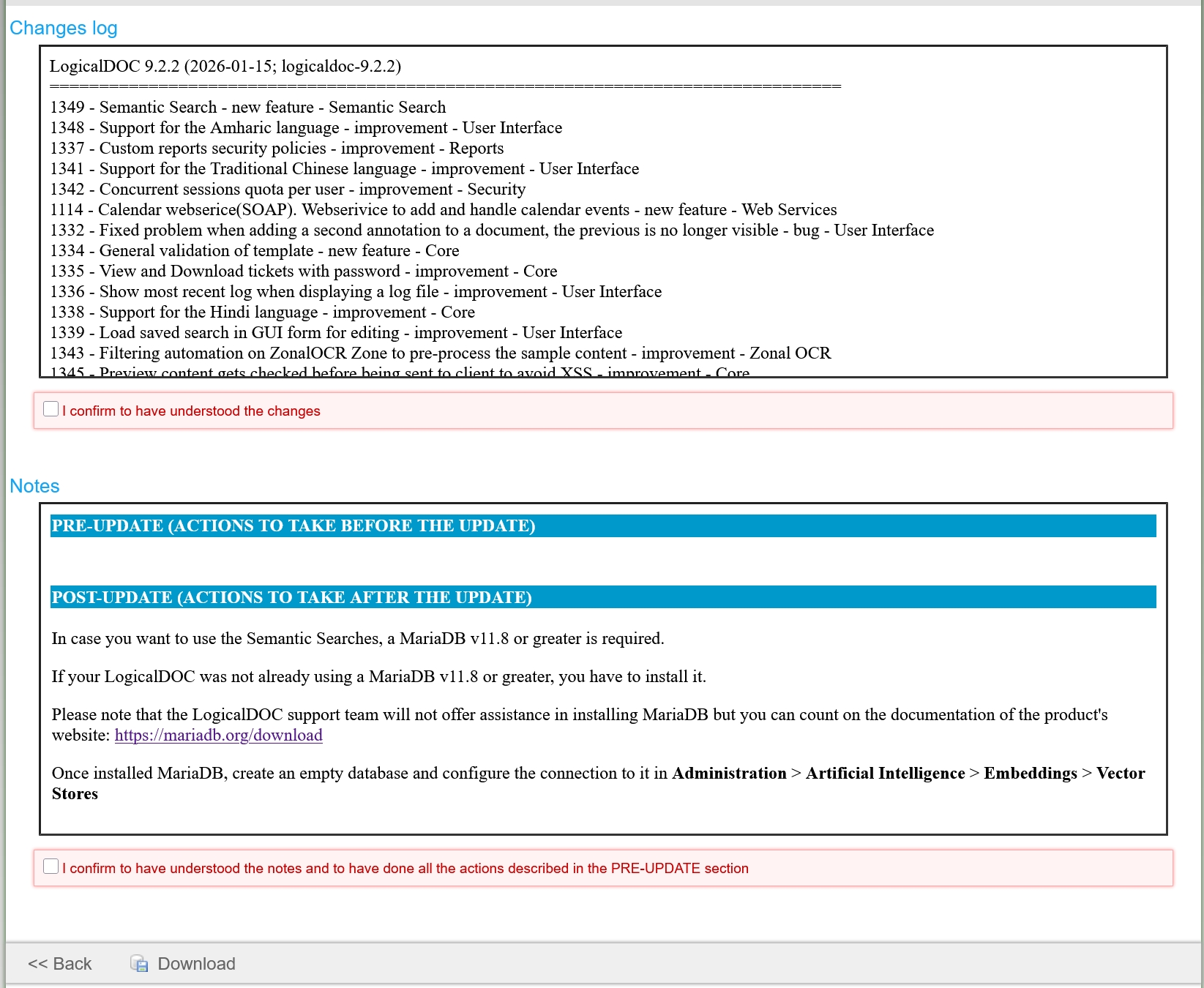 Para descargar, debes leer y confirmar tanto el Clanges Log como las Notas de Versión: