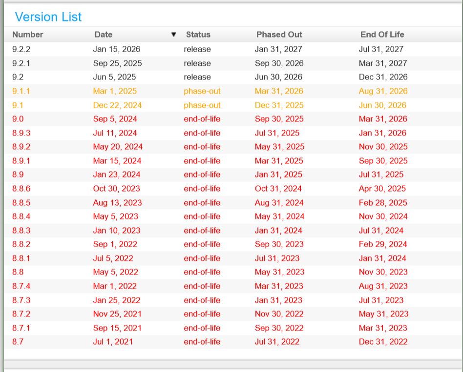 Su sistema de producción siempre debe ejecutar una versión en estado release para beneficiarse del soporte completo, ya que las versiones phased-out o end-of-life ofrecen un soporte muy limitado o ninguno. Por favor, revise cuidadosamente la Política de Fin de Vida (EOLP).